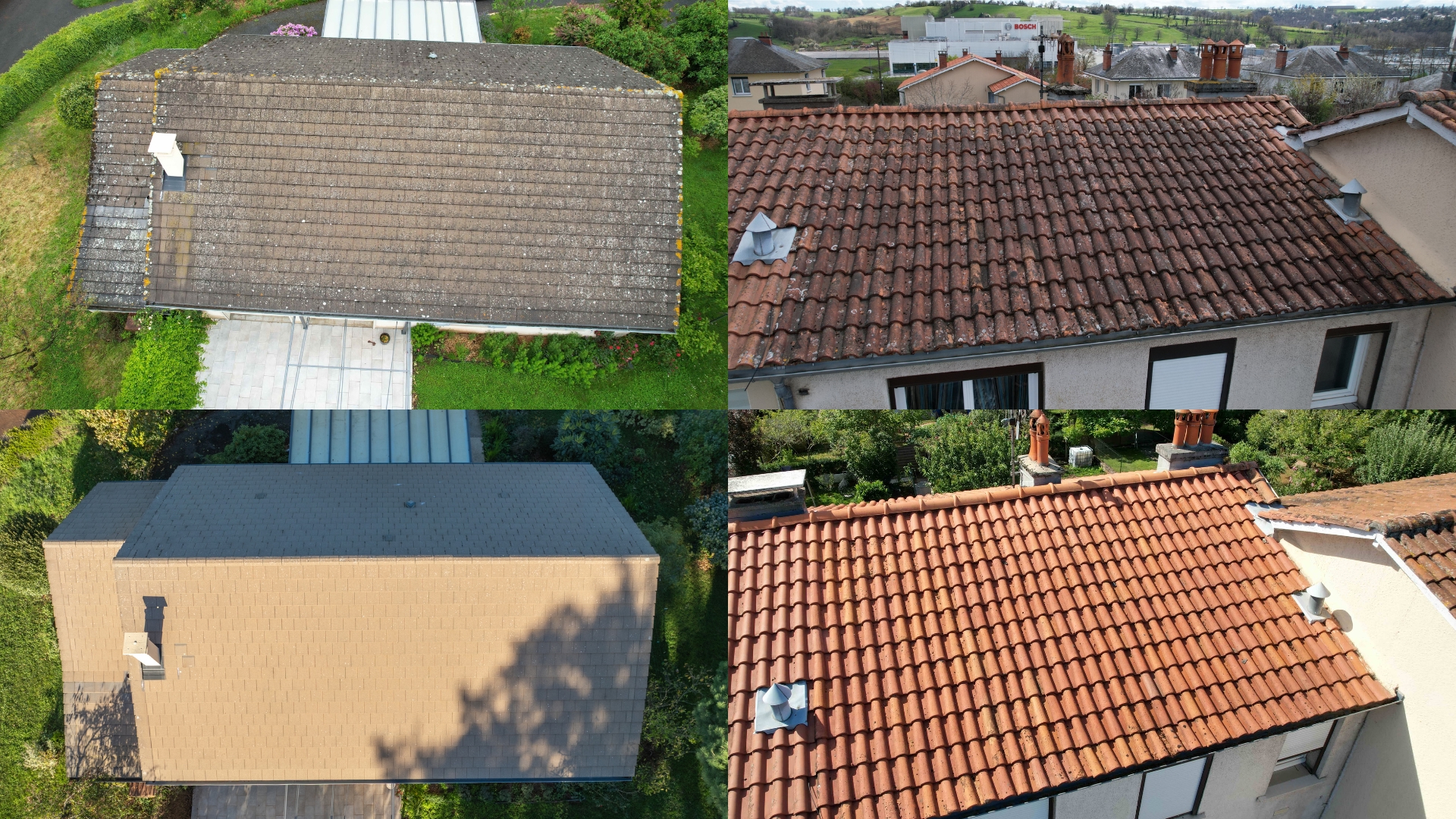 Les surfaces sont traitées avec précision, en préservant l’intégrité des matériaux, qu’il s’agisse de tuiles mécaniques, tuiles plates, tuiles canal, ardoises, bac acier ou membranes. Chaque type de toiture bénéficie d’un nettoyage ciblé et adapté, garantissant un résultat homogène et respectueux de la structure, tout en prolongeant la durabilité et l’esthétique du bâtiment.